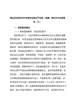 国企党支部2023年落实全面从严治党(党建)责任年中自查报告(三)一、组织落实情况(一)狠抓思想教育,强化党纪意识强化理论学习,习近平新时代中国特色社会主义思想主题教育开展以来,XX党支部坚决贯彻落实习近平总书记重要讲话精神和党中央部署,把理论学习、调查研究、推动发展、检视整改贯通起来,推动主题教育走深走实,以实际行动为加快建设公司贡献力量,突出政治纪律学习,持续深入学习习近平新时代中国特色社会主义思想,坚持度原著、学原文、悟原理,将《习近平谈治国理政》等权威读本列入理论学习组重要内容,统一安排,精心组织。充分利用党员活动日的学习机会,进一步加强习近平总书记新思想、新要求的学习,切实做到重点学...