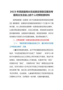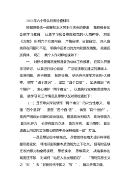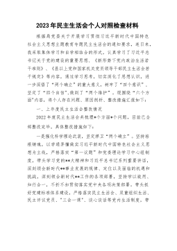 2023年民主生活会个人对照检查材料根据局党委关于开展学习贯彻习近平新时代中国特色社会主义思想主题教育专题民主生活会的通知要求,连日来,我采取集体学习和自学相结合的形式,认真学习了习近平总书记关于党的建设的重要思想、《新形势下党内政治生活若干准则》、《县以上党和国家机关党员领导干部民主生活会若干规定》等内容,通过学习思考,切实深化了思想认识,进一步深悟了“两个确立”的重大意义,树牢了“四个意识”,坚定了“四个自信",做到了“两个维护”。现围绕“六个方面"内容,将个人存在问题、原因剖析、整改措施汇报如下:一、上年度民主生活会整改情况2022年度民主生活会共梳理*个方面*个问题,目前已全部整改完毕...
