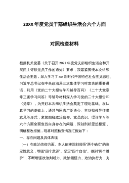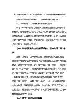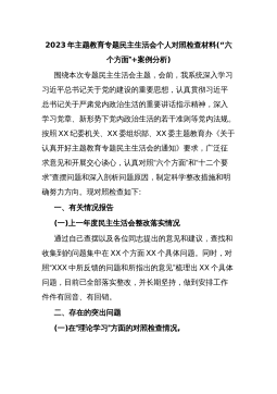 2023年主题教育专题民主生活会个人对照检查材料(“六个方面”+案例分析)围绕本次专题民主生活会主题,会前,我系统深入学习习近平总书记关于党的建设的重要思想,认真贯彻习近平总书记关于严肃党内政治生活的重要讲话指示精神,深入学习党章、新形势下党内政治生活的若干准则等党内法规。按照XX纪委机关、XX委组织部、XX委主题教育办《关于认真开好主题教育专题民主生活会的通知》要求,广泛征求意见和开展交心谈心,认真对照“六个方面”和“十二个要求”查摆问题和深入剖析问题原因,制定科学整改措施和明确努力方向。现对照检查如下:一、有关情况报告(一)上一年度民主生活会整改落实情况通过自己查摆以及各位同志提出的意见和...