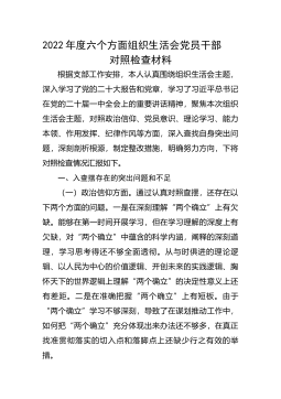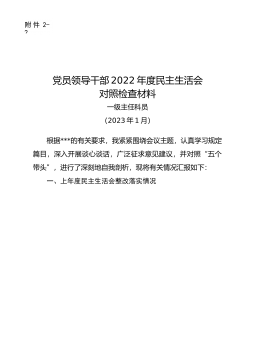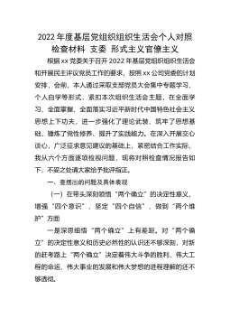 2022年度基层党组织组织生活会个人对照检查材料支委形式主义官僚主义根据xx党委关于召开2022年基层党组织组织生活会和开展民主评议党员工作的要求,按照xx公司党委的计划安排,会前,本人通过采取支部党员大会集中专题学习、个人自学等形式,紧扣本次组织生活会主题,在全面学习、全面掌握、全面落实习近平新时代中国特色社会主义思想上下功夫,进一步强化了理论武装、筑牢了思想基础、锤炼了党性修养、提升了实践能力。在深入开展交心谈心,广泛征求意见建议的基础上,紧密结合工作实际,我从六个方面逐项检视问题,现将对照检查情况报告如下,不妥之处请大家给予批评指正。一、查摆出的问题及具体表现(一)在带头深刻领悟“两个确...