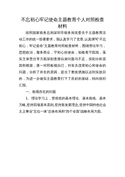 不忘初心牢记使命主题教育个人对照检查材料按照国家税务总局深圳市税务局党委关于主题教育活动工作的统一部署要求,我认真学习了党章,认真撰写“不忘初心,牢记使命”主题教育对照检查材料,围绕理论学习,思想政治,服务群众,守初心担使命,知敬畏守底线,落实主体责任等方面深刻查摆自身问题与不足,深刻分析原因和根源,逐一对照检视自已,对有关违背初心和使命的问题,分析了存在的原因,提出了整改措施以达到实效目的,为进一步做实主题教育打下了良好的基础,特向组织汇报。一、检视存在的问题1、理论学习上,贯彻党的基本理论、基本路线、基本方略,坚持四项基本原则,坚持新发展理念,坚持中国特色社会主义事业“五位一体”总体布局和...