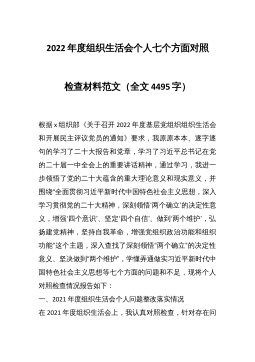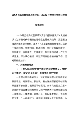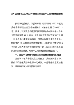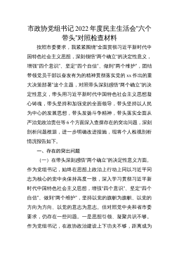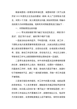 根据省委统一部署安排和省纪委、省委组织部《关于认真开好2022年度民主生活会的通知》精神,本人广泛听取各方意见,对照6个方面,深入查找突出问题,深刻对照剖析,明确今后的努力方向和整改措施。现将有关对照检查情况汇报如下:一、对照检查找出的问题(一)带头深刻领悟“两个确立”的决定性意义,增强“四个意识”、坚定“四个自信”、做到“两个维护”方面一是政治站位有待提升。平时想问题、作决策、抓工作,习惯性从地方发展需要和客观实际出发,从政治高度认识和把握上级决策部署相对不足,自觉站位全国、全省发展大局来思考、谋划、推动工作还有欠缺,存在地方主义、本位主义倾向,导致有些工作与上级部署要求和群众期待还有一定差...
