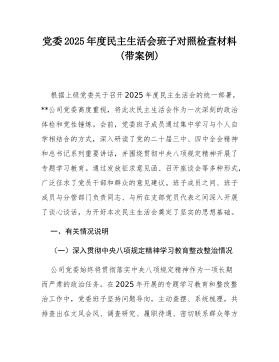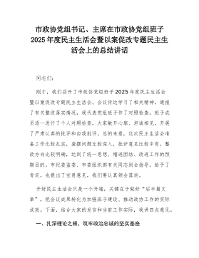 市政协党组书记、主席在市政协党组班子2025年度民主生活会暨以案促改专题民主生活会上的总结讲话同志们:刚才,我们召开了市政协党组班子2025年度民主生活会暨以案促改专题民主生活会。会议传达学习了相关精神,通报了有关整改落实情况,我代表党组班子作了对照检查,班子成员逐一进行了个人对照检查,大家敞开心扉、坦诚相见,开展了严肃认真的批评和自我批评。总的来看,这次民主生活会准备工作比较扎实,查摆问题比较深入,批评意见比较中肯,整改方向比较明确,达到了统一思想、增进团结、改进工作的预期目的。市纪委监委、市委组织部有关同志到会指导,给予了肯定,也提出了宝贵意见,我们要认真领会落实。开好民主生活会只是一个开...
