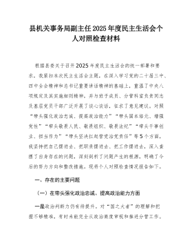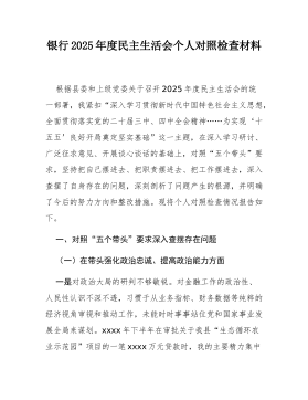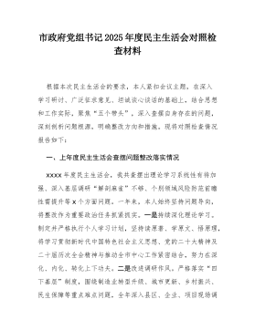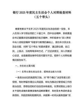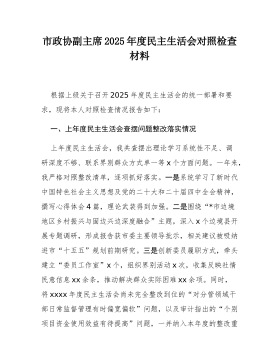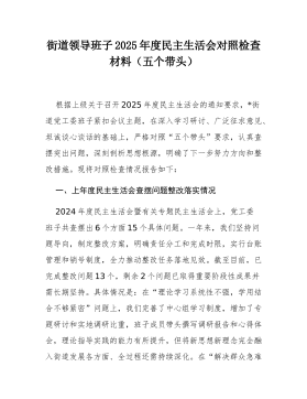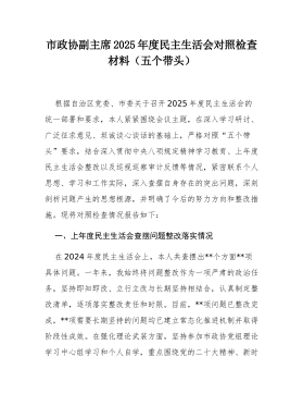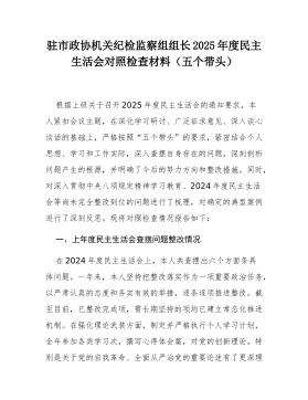 驻市政协机关纪检监察组组长2025年度民主生活会对照检查材料(五个带头)根据上级关于召开2025年度民主生活会的通知要求,本人紧扣会议主题,在深化学习研讨、广泛征求意见、深入谈心谈话的基础上,严格按照“五个带头”的要求,紧密结合个人思想、学习和工作实际,深入查摆自身存在的问题,深刻剖析问题产生的根源,并明确了今后的努力方向和整改措施。同时,对深入贯彻中央八项规定精神学习教育、2024年度民主生活会等尚未完全整改到位的问题进行了梳理,对确定的典型案例进行了深刻反思。现将对照检查情况报告如下:一、上年度民主生活会查摆问题整改情况在2024年度民主生活会上,本人共查摆出六个方面条具体问题。一年来,本...