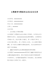 主题教育专题组织生活会会议记录会议时间:××××××××××××会议地点:××××××××××××××参会人员:×××××××××××××主持人:××××××××会议内容:一、会议准备工作情况通报会议通报了专题组织生活会准备工作情况。为开好此次专题组织生活会,×××××××××××××××××高度重视,认真做好各项准备工作。结合近期工作情况,深入开展学习研讨,广泛征求意见建议,深入开展谈心谈话,办公室制作精美PPT,各个党员认真撰写对照检查材料,为会议的顺利召开奠定了坚实基础。二、2023年度组织生活会整改措施落实情况通报会议通报了×××××××××××××××××领导班子2023年度组织生活...
