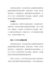 党章是党的总章程。党的全国代表大会根据理论创新和实践创新的需要对党章进行修改,是我们党的一个惯例。现行党章是党的十二大修改制定的。根据形势和任务的发展变化,党的十三大至十九大都对党章作了适当修改。实践证明,这些修改有利于更好发挥党章的规范和指导作用。党章概述这次修改党章,按照党中央确定的原则,对各地区各部门党组织和广大党员对党章提出的修改意见和建议,进行了全面汇集、逐条研究、充分采纳,共对党章作出50处修改。党的二十大通过的党章修正案,共修改50处,其中总纲部分的修改37处,条文部分的修改13处。党的二十大为什么要修改党章党章是党的总章程。党的全国代表大会根据理论创新和实践创新的需要对党章进行...