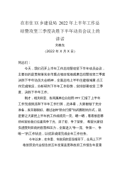 在市住XX乡建设局2022年上半年工作总结暨攻坚三季度决胜下半年动员会议上的讲话刘春光(2022年X月X日)同志们:今天,我们召开上半年工作总结暨攻坚下半年动员会议,主要目的是贯彻落实全市重点项目现场观摩总结暨攻坚三季度决胜下半年动员大会精神,全面总结上半年住建领域重点工作完成情况,分析研判下半年工作形势,安排部署攻坚三季度、决胜下半年工作。刚才,相关科室、各局属单位分别用PPT汇报了上半年工作完成情况和下半年工作打算,总体看,大家都做了充分准备,发言都很好。通过这种“登台打擂”“比武赛跑”的方式,就是要让大家把上半年的工作成绩亮一亮、晒一晒,看看都是哪些科室给我们住建局争了光、添了彩、争了荣...