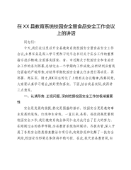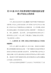 在XX县2025年秋季学期开学暨校园安全管理工作会议上的讲话同志们: 今天,我们在这里召开全县2025年秋季学期开学暨校园安全管理工作会议,主要任务是深入学习贯彻习近平总书记关于教育工作和安全生产的重要论述,认真落实省、市工作部署,分析研判当前我县教育工作及校园安全形势,安排部署下一阶段重点任务。刚才,县教体局、县公安局、县市场监管局的负责同志作了很好的发言,总结了工作,分析了问题,提出了措施,我完全同意。下面,我再讲三点意见。一、认清形势,统一思想,深刻认识抓好校园安全工作的极端重要性百年大计,教育为本;教育大计,安全为基。校园安全是教育事业持续健康发展的底线,是每一个孩子健康成长的基本保障...