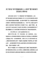 “”关于参加保守国家秘密人人有责警示教育月活动的心得体会近期,我深入参加了XX“局组织的保守国家秘密人人有”责警示教育月系列活动,特别是8月26日召开的保密警示教育大会,使我深受触动和警醒。会议集中观看了发人深省的保密警示教育片,局领导的讲话更是语重心长、字字千钧,为我们全体干部职工在新形势下做好保密工作指明了方向、敲响了警钟。通过此次学习,结合自身工作实际,我保密工作的极端重要性有了对更加清醒的认识,对如何履行好保密责任有了更加深刻的思考。一、深化思想认识,以案为鉴绷紧保密之弦保密工作无小事,一字一句总关情,一举一动系安全。过去,我然也到保密的重要性虽认识,但有时会不自觉地认为泄密离自己很遥...