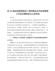 在XX县应急管理局深入贯彻落实全市应急管理工作会议精神会议上的讲话同志们:今天,我们在这里召开全局专题会议,主要任务是深入学习传达、全面贯彻落实刚刚闭幕的全市应急管理工作会议精神,结合我县实际,总结过往,分析形势,对当前和今后一个时期的应急管理重点工作进行再动员、再部署、再落实。刚才,几位同志传达了市委、市政府主要领导的重要讲话和会议的核心精神,大家要认真学习、深刻领会。下面,围绕如何将市里的会议精神转化为我县应急管理工作的具体行动和实际成效,我讲几点意见。一、回顾过去,肯定成绩,在砥砺前行中坚定高质量发展的信心与决心2024年以来,面对复杂严峻的安全生产形势和艰巨繁重的防灾减灾救灾任务,在县...