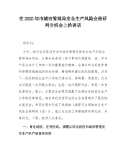 在2025年市城市管理局安全生产风险会商研判分析会上的讲话同志们:今天,我们在这里召开全市城市管理系统安全生产风险会商研判分析会,主要任务是深入学习贯彻近期国家、省、市关于安全生产工作的一系列重要指示精神,全面分析当前我市城市管理领域面临的安全形势,精准研判潜在的风险隐患,并对下一阶段的安全生产工作进行再动员、再部署、再落实。这次会议既是一次形势分析会,也是一次问题研判会,更是一次责任落实会。刚才,分管安全的同志通报了近期全系统安全生产工作的总体情况,相关单位负责同志结合各自领域作了很好的交流发言,共同会商并形成了我局的《城管行业领域安全生产风险会商研判(表)》,我认为这些工作都做得非常扎实、...