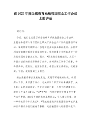 在XX镇教育系统校园安全工作会议上的讲话(精品)同志们:今天,我们在这里召开全镇教育系统校园安全工作会议,主要任务是深入学习贯彻上级关于安全生产工作的重要指示精神,深刻吸取近期国内一些地区发生的安全事故教训,分析研判当前我镇校园安全面临的形势,安排部署今冬明春及下一阶段的校园安全重点工作。刚才,XX同志结合我镇实际,从五个方面对当前的安全形势作了分析,并对具体工作作了部署,讲得很具体,很到位,我完全同意,希望大家认真领会,抓好落实。下面,我再强调三点意见。安全是教育事业发展的底线,更是不可逾越的红线。校园安全工作,责任重于泰山,它关系到千家万户的幸福安宁,关系到社会的和谐稳定,更关系到我们每一...