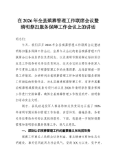 在2026年全县殡葬管理工作联席会议暨清明祭扫服务保障工作会议上的讲话同志们:今天,我们召开2026年全县殡葬管理工作联席会议暨清明祭扫服务保障工作会议。出席今天会议的有县殡葬管理工作联席会议各成员单位负责同志,以及清明节期间群众祭扫活动应急工作组各有关单位负责同志。这次会议的主要任务是深入学习贯彻上级关于殡葬管理工作的决策部署,总结回顾前一阶段工作情况,分析研判当前殡葬管理工作和清明祭扫服务保障工作面临的形势任务,对扎实推进殡葬管理工作、有序开展整治殡葬领域腐败乱象专项行动以及2026年清明祭扫服务保障工作进行安排部署,确保全县殡葬管理工作规范有序、清明祭扫活动安全文明。刚才,县民政退役军人...