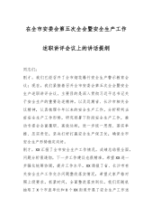 在全市安委会第五次全会暨安全生产工作述职讲评会议上的讲话提纲同志们:刚才,我们已经召开了全市烟花爆竹安全生产警示教育会议;现在,我们紧接着召开全市安委会第五次全会暨安全生产述职讲评会议。主要目的是深入贯彻习近平总书记关于安全生产的重要论述精神,以及近期省、长沙市相关会议精神,认真梳理今年以来的安全生产工作,分析研判当前安全生产工作形势,研究部署下阶段安全生产工作,推动专委会全面履职、高效运转,进一步统一思想、落实举措、压实责任,坚决打好打赢安全生产保卫仗,确保全市安全生产形势稳定向好。刚才,XX汇报了全市安全生产工作情况,成绩总结很全面,问题分析很透彻,下一步工作建议也很精准。希望XX进一步强...