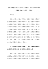 在学习贯彻党的二十届三中全会精神、奋力开创全面深化改革新局面工作会议上的讲话同志们:党的二十届三中全会召开后,省国资委安排部署学习宣传和贯彻落实全会精神相关工作,指出要着力推动党中央决策部署在全省国资国企落地生根、见行见效。国有企业作为中国特色社会主义的重要物质基础和政治基础,作为党执政兴国的重要支柱和依靠力量,在完整、准确、全面贯彻新发展理念和推动全面深化改革中应承担重要的使命和任务。我们要全面学习贯彻党的二十届三中全会精神,持续用好改革开放这个关键一招和重要法宝,统筹推进党建、经营、管理、文化、安全等重点领域改革,为不断推动企业高质量发展增动力、添活力。一、深刻领会全会的重大意义、丰富内涵...