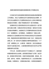 稳增长提质效防风险推动高质量发展工作部署会讲话今天我们召开全系统稳增长提质效防风险推动高质量发展工作部署会,传达了全国稳住经济大盘电视电话会议精神、林武书记在全省稳经济工作部署电视电话会议上的批示精神和蓝佛安省长讲话要求,解读了我省稳住经济一揽子政策措施。全国稳住经济大盘电视电话会议对扎实稳住经济一揽子措施作出重大部署,对推动经济回归正常轨道、确保运行在合理区间提出明确要求。全省稳经济工作部署电视电话会议坚决落实D“疫情要防住、经济要稳住、发展要安全”的重大决策,就我省全力以赴稳增长保市场主体保就业保民生作出全面系统安排。集团各级各单位要把思想和行动统一到D、国务院决策部署上来,统一到林武书记...