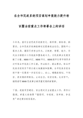 在全市民政系统项目谋划申报能力提升培训暨当前重点工作部署会上的讲话今年来,面对全省民政系统新变化、新形势、新标准、新要求,全市民政系统都能够切实提高政治站位,围绕中心服务大局、履职尽责担当作为,从制度、管理、能力、作风各方面提升工作效能和整体战斗力,为民政事业发展贡献了力量。XXXX书记、XXXX市长、XXXX副市长等市领导多次听取全市民政工作汇报,作出批示、提出要求,给全市民政系统党员干部以极大地激励和鼓舞。全市民政系统各级干部一定要进一步坚定信心、决心,增强抓规划、干项目、抓发展的积极性,主动出击,攻坚克难,扎实苦干,继续谱写XXXX民政事业高质量发展的新篇章。下面,我就项目建设、安全稳定...