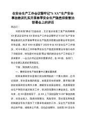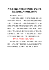在全区“防风险保稳定”、汛期安全生产暨2022年第三季度安委会全体(扩大)会议上的讲话同志们:今天会议主要目的是深入贯彻落实省市防风险保稳定会议精神和6月22日全市汛期安全生产紧急电视电话会议精神,对我区下半年安全生产、应急管理工作进行安排部署。刚才,*同志传达了国家、省、市领导有关防汛救灾工作指示批示精神和全市汛期安全防范工作紧急电视电话会议精神,特区应急管理局通报了全区2022年上半年安全生产、应急管理和自然灾害工作开展情况,介绍了特区成立应急救援总指挥部及专项应急指挥部情况,有关部门和企业作了发言,参会的各位副区长也就自己分管领域的安全生产工作进行了安排,请大家认真抓好落实,下面,我再讲...