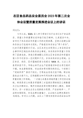 在区食品药品安全委员会2023年第二次全体会议暨质量发展推进会议上的讲话同志们:今年以来,XXX深入学习贯彻习近平总书记关于食品药品、质量工作的重要论述和指示批示精神,认真落实中央、省市关于食品药品和质量工作的决策部署,坚持以创建全国食品安全示范城市为契机,严格落实食品安全"两个责任",扎实开展质量提升行动,全区未发生非级别以上食品药品安全事件和区域性食品药品安全事故,食品药品和质量工作取得了显著成效。但我们要清醒认识到全区食品药品和质量发展工作中还存在一些问题和不足,在食品药品安全领域,全区食品、药品、医疗器械经营主体超过XXX家,从业人员素质参差不齐,市场主体守法生产经营意识和安全责任意识...