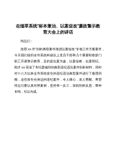在全市烟草系统“标本兼治、以案促改”廉政警示教育大会上的讲话同志们:按照xx市“剖析典型案件推进以案促改”专项工作方案要求,今天我们组织全市系统科级以上党员干部和几个重要职权部门职工开展警示教育,目的是以案为鉴,以案促教以案明纪。刚才xx宣读了市纪委编印的典型违纪违法案件剖析材料,同时对十八大以来全市系统发生的违纪违法典型案件进行了梳理回顾,这些发生在身边的违纪案件,令人痛心,发人警醒。希望同志们要认真对照案例,坚持举一反三,深刻剖析反思,警钟长鸣,引以为戒。我经常讲,我们工作生活中,有两个方面绝不能出问题,一个是安全问题,一旦发生就是危及生命财产安全的大事另一个就是廉洁问题,一个人,如果在工...