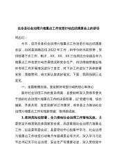 在全县社会治理六项重点工作攻坚行动总结调度会上的讲话同志们:今天,召开全县社会治理六项重点工作攻坚行动总结调度会议,目的是回顾总结2022年工作,科学分析当前形势,安排部署下步工作。刚才,XX、XX、XX三位同志分别就去年六项重点工作攻坚行动开展情况和安全生产、信访维稳禁毒反电诈专班工作开展情况进行了发言,对下步工作进行了具体部署安排,我都赞同,请大家认真抓好落实。下面,我再强调三点意见。一、全面梳理总结,坚定抓好攻坚行动的信心和决心面对社会治理工作的复杂局面,县委始终深入贯彻市委关于抓好社会治理六项重点工作的决策部署,以“党建引领、综合施策、齐抓共管、攻坚克难”的工作要求,举全县之力推动社会...