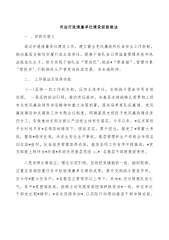 司法行政系统清廉单位建设工作经验做法一、目的及意义通过开展清廉单位建设工作,建立健全党风廉政和队伍安全工作机制,推动基层支部切实履行起主体责任,提高干部队伍日常监督管理质效和执法规范化水平,努力实现干部队伍“零违纪”,规范*“零差错”,管理对象“零投诉”,不断推进从严管党向纵深发展、向末端延伸。二、工作做法及取得实效(一)坚持一切工作到支部,压实主体责任,支部战斗堡垒作用有效发挥。一是坚持政治引领,推动责任落实。各基层支部能够认真贯彻上级有关党风廉政领导讲话精神和重大决策部署,落实每季度队伍廉情、党风廉政建设和反腐败工作专题会议制度,明确基层支部班子党风廉政建设责任分工,有效推动支部全面从严治...
