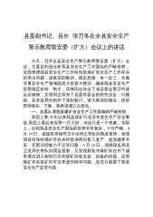 县委副书记、县长张万冬在全县安全生产警示教育暨安委(扩大)会议上的讲话今天,召开全县安全生产警示教育暨安委(扩大)会议,主要目的是分析我县安全生产工作面临的严峻形势,全面查摆我县安全生产工作特别是煤矿安全生产工作存在的突出问题,汲取深刻教训,痛定思痛,举一反三,全面开展安全生产领域隐患大排查大整治,确保我县安全生产形势稳定好转。刚才,庆锋同志传达了省安委会警示约谈会议精神,文明同志宣布了县委常委会的研究决定,行廊镇、县安监局分别作了深刻检讨,请大家深刻领会,抓好贯彻落实。下面,我再强调三点意见。一、全面认清我县煤矿安全生产工作面临的严峻形势表面上看,今年以来我县煤矿行业没有发生生产安全事故,表...