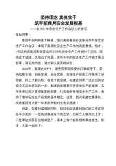 坚持理念真抓实干筑牢招商局安全发展根基——在2021年安全生产工作会议上的讲话各位同事:集团年会刚刚落下帷幕,我们紧接着就在这里召开年度安全生产工作会议,体现了集团对安全生产工作的高度重视。刚才,×同志代表集团和安委会对2020年安全生产工作进行了总结,既肯定了成绩,又指出了问题,并对今年的安全生产工作做了重点部署,我完全同意,请大家认真贯彻执行。2020年,集团在D中Y、国务院和国资委的正确领导下,坚持战略引领、创新发展、安全发展,各项生产经营工作取得了新突破、跨上了新台阶、创造了新成就,在建设世界一流企业的征程中又迈出坚实的一步。集团的发展离不开安全生产的保障,去年各单位深入贯彻集团的部署...