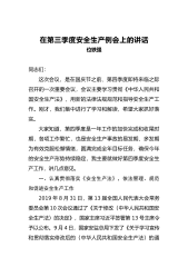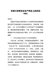 全县第三季度安全生产工作例会暨中秋、国庆“两节”期间安全生产部署会讲话同志们:根据会议安排,我就分管的道路交通、社会消防、地质灾害防治、民爆物品和建筑安全工作讲五点意见。一、认清形势,坚决打好道路交通安全专项整治攻坚战第三季度以来,各类道路交通安全事故多发、频发,特别是“7.14”较交通大事故的发生,致使我们上半年取得的工作成效被否定,全年目标任务考核面临着很大的压力通过前段时间督促检查来看,仍然存在着诸多问题,一是人员经费保障不到位。个别乡镇道安办无专职办公人员,存在身兼多职现象,少部分乡镇经费保障未按要求落实到位。二是路面管控不力。每月组织上路查车次数少,未坚持场天和相邻乡镇场天上路查车,...