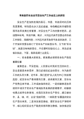在全市安全生产工作会议上的讲话同志们:市委、市政府决定今天召开全市安全生产大会,专题安排部署安全生产工作,足以说明市委、市政府对这项工作的高度重视和此次会议的重要性。刚才,各位副市长分别对分管的安全生产和当前工作进行了安排部署,这是市政府集体研究的意见,希望各镇办、各单位结合实际,认真抓好贯彻落实。今年以来,在大家的共同努力下,同心协力抓安全生产,抓各项责任的落实,全市安全生产保持了“零事故”的状态,说明大家的工作都很努力,市委、市政府对大家的工作是比较满意的。但是,我们也要保持清醒忧患,我们工作中还存在一些问题:一是较长时间稳定向好的安全生产态势,让部分单位放松了警惕,思想上有所麻痹和懈怠。...