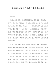 XX镇2026年三级干部大会讲话稿(精品)同志们:律回春渐,新元肇启。今天,我们在此隆重召开XX镇2026年三级干部大会。这既是一次回顾过去、总结经验的盘点会,更是一次展望未来、明确任务的动员会。刚才,镇党委班子成员已就今年的各项重点工作进行了全面部署,相关部门和XX村的负责同志也作了表态发言,态度坚决,措施有力。希望大家深刻领会会议精神,以高度的责任感和紧迫感,全力抓好贯彻落实。回望刚刚过去的2025年,这是“十四五”规划的收官之年,也是我们应对挑战、砥砺前行的关键一年。在XX市委、市政府的坚强领导下,全镇上下团结一心,锐意进取,交出了一份厚重提气、亮点纷呈的年度答卷。高质量发展迈上新台阶。...
