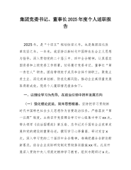 XX集团党委书记、董事长2025年度个人述职报告(精品)2025年,是"十四五"规划收官之年,也是集团深化改革攻坚之年。一年来,我坚持以习近平新时代中国特色社会主义思想为指导,深入贯彻党的二十届三中、四中全会精神,认真落实国资委和上级党委工作部署,切实履行党委书记、董事长"第一责任人"职责,团结带领班子成员和全体干部职工,聚焦主责主业、深化改革创新、防范化解风险,推动企业高质量发展取得新成效。现将个人履职情况报告如下:一、以理论学习为先导,在政治引领中把牢发展方向(一)强化理论武装,筑牢思想根基坚持把学习贯彻习近平新时代中国特色社会主义思想作为首要政治任务,严格落实"第一议题"制度,主持召开党...