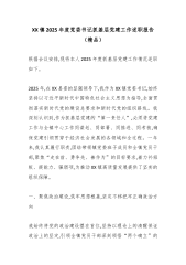 XX镇2025年度党委书记抓基层党建工作述职报告(精品)根据会议安排,现将本人2025年度抓基层党建工作情况述职如下。2025年,在XX县委的坚强领导下,我作为XX镇党委书记,始终坚持以习近平新时代中国特色社会主义思想为指导,全面贯彻落实新时代党的建设总要求和新时代党的组织路线。我深刻认识到,作为抓基层党建的“第一责任人”,必须将党建工作与全镇中心工作同谋划、同部署、同推进、同考核,确保党建引领贯穿于经济社会发展的各领域和全过程。一年来,我认真履行职责,团结带领镇党委班子成员和全镇党员干部,聚焦“走在前、勇争先、善作为”的目标要求,着力补短板、提能力、强弱项,为推动XX镇高质量发展提供了坚实的...