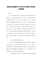 在县社会治理中心2025年半年度工作会议上的讲话同志们:今天,我们在这里召开中心2025年半年度工作会议暨中层干部汇报会,主要任务是全面总结上半年工作,深入分析当前形势,安排部署下半年任务,动员中心全体干部职工进一步统一思想、提振精神,确保圆满完成全年各项目标。刚才,各科室负责同志都作了很好的发言,总结了成绩,查摆了问题,也明确了下半年的工作思路。班子成员也结合分管领域,对我们正在推进的八项重点工作逐一进行了点评,提出了具体要求,我都同意。总的来看,今年上半年,面对复杂严峻的外部环境和艰巨繁重的治理任务,中心全体上下同心同德、攻坚克难,推动各项工作取得了新进展、新成效。在此,我代表中心党组,向...