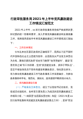 行政审批服务局2021年上半年党风廉政建设工作情况汇报范文2021年上半年,xx区行政审批服务局党组严格按照区委、区纪委的统一部署和要求,深入开展党风廉政建设和反腐倡廉工作。现将我局党组半年来党风廉政建设工作开展情况汇报如下:一、工作总体情况今年以来在区委区政府的正确领导下,我局以习近平新时代中国特色社会主义思想为指导,全面落实从严治党主体责任为主线,聚焦区委区政府“党史学习教育”“改革突破年”、建设“至善至美之城”等工作部署,坚持“抓党建促业务、抓班子带队伍”,坚定不移加强党员干部作风建设和廉政意识,强化责任担当,有力推动党风廉政建设工作与政务服务工作深度融合,为推动政务服务科学化、规范化、...