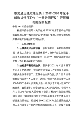 市交通运输局党组关于2019-2020年度干部选拔任用工作“一报告两评议”开展情况的综合报告中共xxx市委组织部:根据市委组织部《关于做好20XX年度市管单位干部选拔任用工作“一报告两评议”的通知》要求,现将交通系统开展此项工作综合情况报告如下。一、工作开展情况1.认真高做好会前准备。收到通知后,局党组高度重视,落实人员责任,提出具体要求,分析干部队伍现状,梳理2年来选拔任用基本情况,形成了“一报告”及相关统计资料,为开好会议奠定了基础。2.按程序严密组织会议。我局于2021年X月1日下午召开了交通系统“一报告两评议”会议,在家局班子成员、局机关全体干部职工、直属单位主要负责人及1至2名干部群...
