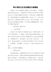审计局民主生活会整改方案模板根据关于召开主题教育专题民主生活会精神,为加强和规范党内政治生活,不断推进学习贯彻习近平新时代中国特色社会主义思想主题教育走深走实、取得成效,按照组织制度、组织原则要求和主题教育部署,*月*日上午,区审计局党组召开了主题教育专题民主生活会。通过认真查找、班子成员点评共梳理出*项问题,为认真抓好问题整改落实,制定如下整改实施方案。一、指导思想、整改目标(一)指导思想。坚持以习近平新时代中国特色社会主义思想为指导,深入学习贯彻党的二十大精神,始终坚持和加强党的领导,按照中央和省市区委关于做好主题教育民主生活会的部署要求,对照理论学习、政治素质、能力本领、担当作为、工作作...