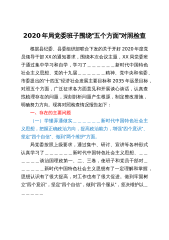 2020年局党委班子围绕“五个方面”对照检查根据县纪委、县委组织部联合下发的关于开好2020年度党员领导干部XX的通知要求,围绕本次会议主题,XX局党委班子通过集中学习和自学,学习了______新时代中国特色社会主义思想、党的十九届______精神、党中央和省委、市委提出的“十四五”经济社会发展主要目标和2035年远景目标,对照五个方面,广泛征求各方面意见和开展谈心谈话,认真查找梳理存在的问题,深刻剖析问题产生根源,制定整改措施,明确努力方向。现将对照检查情况报告如下:一、存在的主要问题(一)学懂弄通做实______新时代中国特色社会主义思想,把握正确政治方向,提高政治能力,增强“四个意识”、...