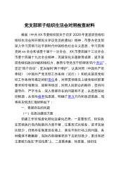 党支部班子组织生活会对照检查材料根据《中共XX市委组织部关于召开2020年度基层党组织组织生活会和开展民主评议党员的通知》精神,市委办党支部深入学习贯彻习近平新时代中国特色社会主义思想,学习贯彻党的xx全会和省委十届十一次全会、XX市委四届十三次全会、市委十四届十九次全会精神,巩固深化主题教育成果,提升基层党组织政治功能和组织力,教育引导党员干部增强“四个意识”,坚定“四个自信”,坚决做到“两个维护”。认真对照《中国共产党章程》《中国共产党支部工作条例(试行)》和机关基层党组织工作条例等规定的职责任务,对照贯彻落实上级党组织部署要求和专项整治、巡察等情况,对照人民群众的期待,坚持问题导向、严字...
