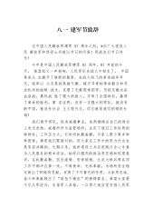在庆祝“八一”建军节主题活动上的讲话:重温军旅岁月铸魂政法铁军同志们:今天是“八一”建军节,院党组组织全院军转干部和退伍军人一起追忆光辉的军旅岁月,传承人民军队伟大的爱国主义精神和英勇无畏的斗争精神,共同庆祝中国人民解放军建军97周年。我们的人民军队是一支英勇抗敌、战功赫赫的英雄军队,自1927年南昌起义开始,中国共产党领导的人民军队历经97载风雨兼程,从抗日战争到解放战争,从土地革命到改革开放,从一个胜利走向又一个胜利。我们的人民军队也是一支威武之师、文明之师,在国家和平发展时期,人民子弟兵英勇冲锋在抗震救灾、疫情防控的第一线,为国家发展保驾护航,为人民撑起坚实的后盾。正是有了伟大的人民军队...