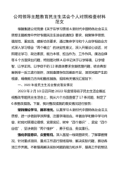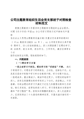 公司主题教育组织生活会党支部班子对照检查材料范文根据主题教育工作要求和主题教育专题组织生活会要求,对照《关于印发<中国xx分公司学习贯彻习近平新时代中国特色社会主义思想主题教育实施方案>及重点任务清单的通知》(中xx教组发(2023)xx号),xx公司党支部在认真开展专题学习、谈心谈话的基础上,深入对照查摆了在理论学习、政治素质、能力本领、担当作为、工作作风、廉洁自律等6个方面存在的突出问题。现检视剖析如下:一、问题查摆(一)理论学习方面一是主动学习不到位,理论学习的“系统性”不够。满足于常规学习,对理论学习的积极性、主动性、创新性不足,尤其是支委班子的集中学习和讨论做得不够,学习专题不突出,...