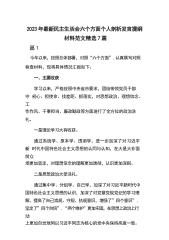 2023年最新民主生活会六个方面个人剖析发言提纲材料范文精选7篇篇1今年以来,按照总体部署,对照“六个方面”,认真撰写对照检查材料,现将具体情况汇报如下:一、主要收获学习以来,严格按照中央省市要求,团结带领党员干部守初心、担使命、找差距、抓落实,对思想政治、理想信念、工作作风、干事担当、廉政勤政等方面进行了全方位的政治洗礼。一是理论学习大有收获。通过系统学、原本学、透彻学,进一步加深了对习近平新时代中国特色社会主义思想的认同与认知,在大是大非面前立场更加坚定,对理想信念的理解更加透彻,认识更加深刻。二是思想政治大受洗礼。通过集中学、分组学、自己学,加深了对习近平新时代中国特色社会主义思想的认识...