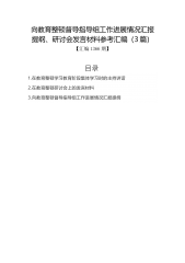 向教育整顿督导指导组工作进展情况汇报提纲、研讨会发言材料参考汇编(3篇)【汇编1366期】目录1.在教育整顿学习教育阶段集体学习时的主持讲话2.在教育整顿研讨会上的发言材料3.向教育整顿督导指导组工作进展情况汇报提纲在教育整顿学习教育阶段集体学习时的主持讲话同志们:开展教育整顿,是当纪检监察系统的重要政治任务。要将学习教育作为先导并贯穿教育整顿工作始终,不断夯实教育整顿的思想基础。XX书记在上次集体学习会上强调,集团全体纪检监察干部既是教育整顿工作的参与者,更是接受教育整顿的直接对象,要坚持全员参与、全面覆盖,不挂空挡、不落一人,坚持带头接受教育、主动参与整顿。下面开始学习教育阶段第三次集体...