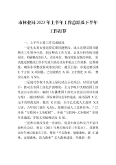 2023一、上半年主要工作完成情况一是扎实某市委巡察反馈问题整改。成立巡察反馈问题整改工作领导小组,制定整改工作方案,认真分析查找问题原因,明确整改责任人、责任单位、整改时限及整改举措,坚决把巡察整改工作作为重大政治任务和重点工作来抓,定期调度,确保各项整改要求落实到位。截至目前,市委巡察反馈X个方面X项问题,已完成整改X项,正在推进X项,整改完成率X.X%。二是成功争取中央国土绿化试点示范项目。以项目为抓手,推动全市国土绿化扩面增效,全力争取中央财政国土绿化试点示范项目,编制《X某市国土绿化示范试点项目实施方案》,通过财政部、国家林草局竞争性选拔,成功获得X亿元中央财政支持。截至X月底,全市...