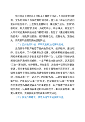 党小组会上对全局干部职工开展教育培训,X年开展警示教育、业务培训等X余次教育培训活动,提升班子和队伍的政治意识和业务水平。三是加强监督制约,规范权力运行。按照“岗权对应、岗人相符”的原则,局党组班子、班子成员、科室及个人均对岗位廉政风险点进行梳理排查,制定了《廉政建设风险防控表》,细化防控措施,做到教育在先、提醒在先、预防在先,切实筑牢拒腐防变的思想防线。(二)坚持政治引领,严明党的政治纪律和规矩。党员领导干部严格遵守党的政治纪律、组织纪律、廉洁纪律、群众纪律、工作纪律和生活纪律,把纪律和规矩挺在前面,用纪律和规矩的尺子衡量党员干部的行为,以实际行动维护党规党纪的严肃性和权威性。一是严格党内政...