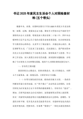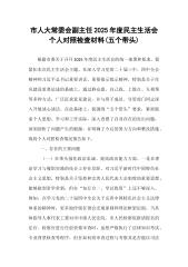 市人大常委会副主任2025年度民主生活会个人对照检查材料(五个带头)根据市委关于召开2025年度民主生活会的统一部署和要求,我紧扣本次民主生活会主题,在深入学习党的二十届三中、四中全会精神和习近平总书记重要讲话、重要指示批示精神,特别是关于作风建设重要论述的基础上,通过群众提、自己找、上级点、互相帮等多种方式,广泛征求意见建议,并与班子成员、分管部门同志深入开展谈心谈话。在此基础上,我围绕“五个带头”要求,紧密联系个人思想、学习和工作实际,深入查摆了自身存在的突出问题,深刻剖析了问题产生的根源,并明确了今后的努力方向和整改措施。现将个人对照检查情况报告如下。一、存在的主要问题(一)在带头强化政...