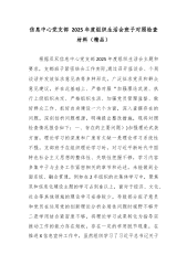 XXXX信息中心党支部2025年度组织生活会班子对照检查材料根据XXXX信息中心党支部2025年度组织生活会主题和要求,支部班子紧密结合工作实际,通过召开座谈会、个别谈话、发放征求意见表等多种形式,广泛征求党员和群众意见建议,并在此基础上,严格对照“加强理论武装、执行上级组织决定、严格组织生活、加强党员管理监督、做好群众工作、抓好自身建设”六个方面,深入查摆存在的问题,深刻剖析问题根源,明确提出整改措施。现将对照检查情况报告如下:一、存在的主要问题(一)加强理论武装方面,理论学习的深度和广度有欠缺一是理论学习系统性不强。支部班子在组织理论学习时,对习近平新时代中国特色社会主义思想的整体性、关联...