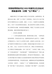 市财政局党组书记2025年度民主生活会对照检查材料(对照“五个带头”)根据市委关于召开2025年度民主生活会的统一部署和要求,我紧扣会议主题,对照“五个带头”具体要求,在深入学习习近平新时代中国特色社会主义思想、党的二十大及二十届四中全会精神基础上,结合广泛征求到的意见建议、谈心谈话和本人思想工作实际,深入查摆突出问题,深刻剖析问题根源,明确了今后的努力方向和整改措施。现将对照检查情况报告如下。一、存在的主要问题(一)在带头强化政治忠诚、提高政治能力方面。一是理论武装的系统性、转化性仍有不足。能够坚持参加中心组学习、专题研讨等集体学习,但在个人自学的主动性、系统性上还有欠缺。对习近平新时代中国...