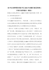 XX市应急管理局党组书记2025年度履行基层党建工作责任述职报告(精品)根据会议安排,现将本人2025年度履行基层党建工作第一责任人职责情况报告如下。一、上年度问题整改情况针对2024年度述职评议、市委巡察、工委交办及专题民主生活会查摆出的问题,局党组高度重视,坚持问题导向,逐项制定措施,狠抓整改落实,已全部整改到位并长期坚持。一是针对“党建与业务融合不够深入,存在‘两张皮’现象”的问题。整改措施方面,本人牵头制定了《党建与应急管理业务深度融合考评办法(试行)》,明确了融合的目标、路径和评价标准。大力推行“支部建在救援一线”工作法,在重大应急任务中同步建立临时党组织。整改成效方面,党建工作的中...