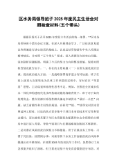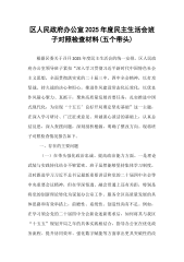 区人民政府办公室2025年度民主生活会班子对照检查材料(五个带头)根据区委关于召开2025年度民主生活会的统一安排,区人民政府办公室领导班子紧扣“深入学习贯彻习近平新时代中国特色社会主义思想,全面贯彻落实党的二十届三中、四中全会精神,以打攻坚战、持久战的决心和恒心,推进作风建设常态化长效化,以优良作风凝心聚力、真抓干,聚焦高质量发展首要任务,扎实推进中国式现代化,为实现‘十五五’良好开局奠定坚实基础”这一主题,在深入学习研讨、广泛征求意见、坦诚谈心谈话的基础上,认真总结反思,深入查摆问题,深刻剖析根源,明确了整改方向。现将班子对照检查情况报告如下。一、存在的主要问题(一)在带头强化政治忠诚、提...